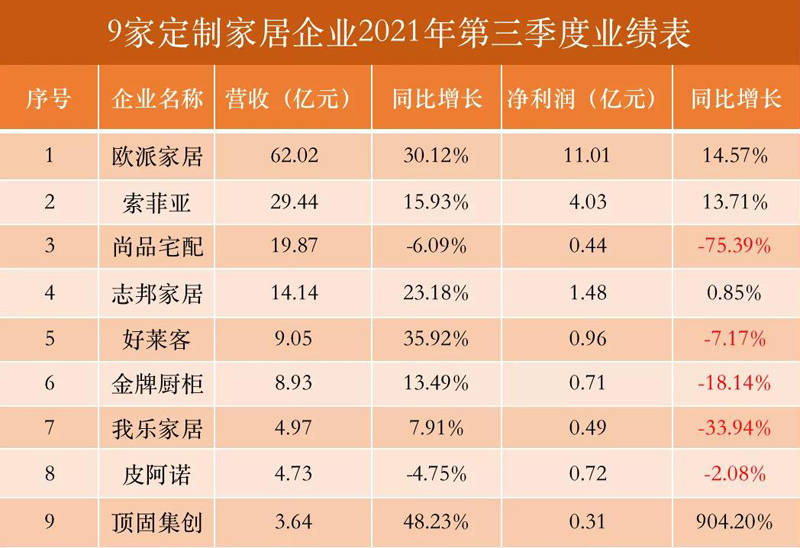 9家上市定制家居企业2021年第三季度业绩表