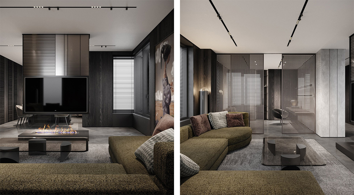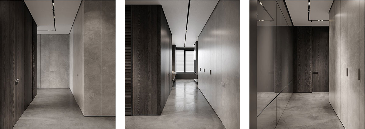 在这个项目中,设计师又大量运用深色木纹,高级绒布和深灰色大理石,创造出另一种低调又奢华的空间氛围。