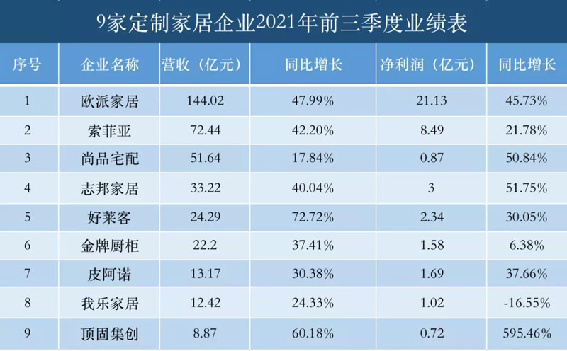 9家上市定制家居企业2021年第三季度业绩表