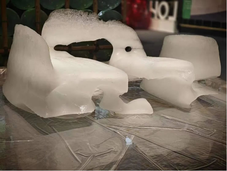 在“可持续设计”展区,策展人许刚用来自广东海岸的海洋浮球打造“漂流瓶”及“融化的冰椅”等艺术装置,让参观者完成与自然环境的对话,探讨消费社会与海洋议题、全球变暖问题的边界。