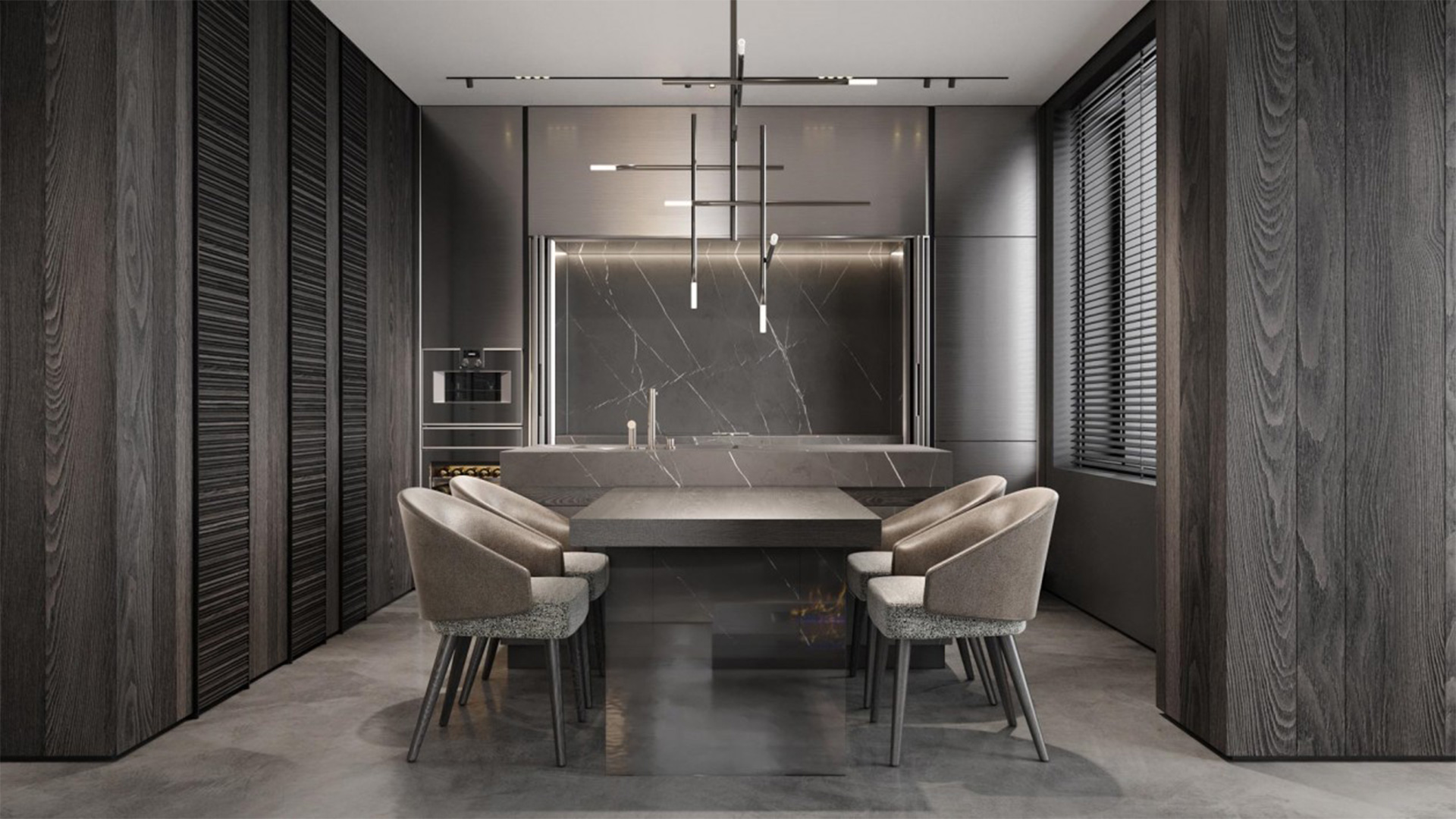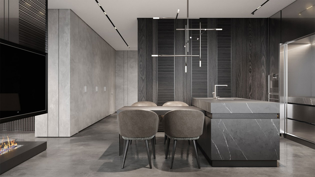在这个项目中,设计师又大量运用深色木纹,高级绒布和深灰色大理石,创造出另一种低调又奢华的空间氛围。
